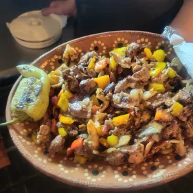 Exquisito corte acompañado de nopalitos asados, guacamole, cebollas asadas y chiles toreados