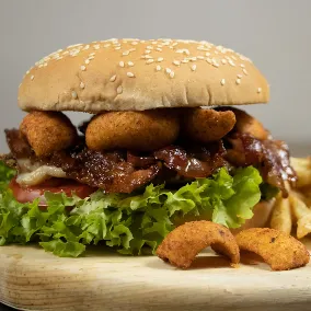 Fritos enchilados, tocino, cebolla salteada, salsa BBQ y queso americano, mayonesa, lechuga, jitomate y cebolla.