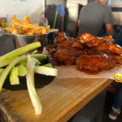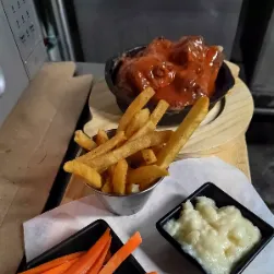 400 Gramos de Costillas con tu salsa preferida acompañadas de zanahoria y 100gr. de papas a la francesa