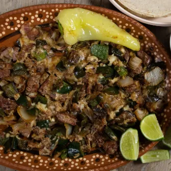 Exquisito corte acompañado de nopalitos asados, guacamole, cebollas asadas y chiles toreados