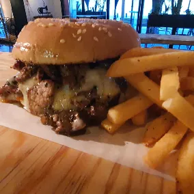 Camarón , arrachera , tocino , pimiento morrón, cebolla y queso fundido.