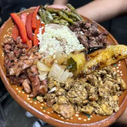 Arrachera, pollo, salchicha para asar, chuleta ahumada, chorizo, frijoles, cebolla asada, chile asado, nopal asado y una quesadilla